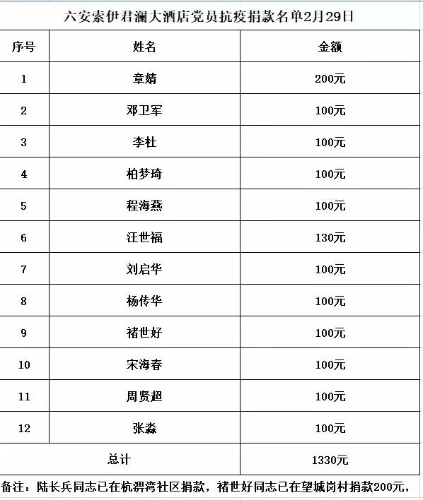 短短的半天時間,索伊廣大黨員共計捐款12380 元,其中機關黨支部捐款4840元,生產系統黨支部捐款580元,成品內配原料黨支部600元,質量工程技術黨支部捐款480元,興大公司黨支部4450元,索伊君瀾黨支部捐款1330元。一份份捐款帶著濃厚的情誼,一句句話語閃爍著黨性的光輝,匯聚成了索伊人的大愛無疆,形成了眾志成城抗擊疫情的濃厚氛圍,武漢,加油!中國,加油!沒有一個冬天不可逾越,也沒有一個春天不會到來!