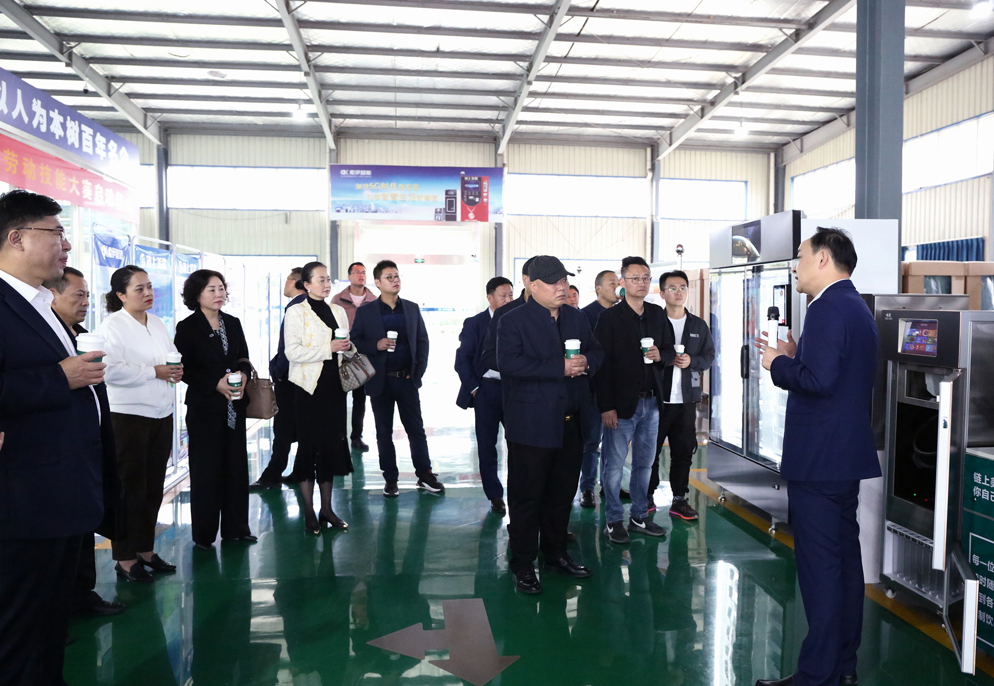 索伊集團董事長助理倪曙東帶領市、區領導及各企業部門負責人首先參觀索伊智能制造車間及產品展示廳,介紹了以智能烹飪機器人、智能機器人飲料機等“智慧餐廚”核心設備,讓大家更直觀的了解機器運行的原理和構造,隨后來到了轉型展示廳,由索伊集團董事長王瓊峰為大家介紹了企業的歷程、探索、升級的轉型之路,聽完王董事長介紹后在場人員紛紛感慨索伊集團的發展之快,并對智慧廚房的趨勢表示充分的認可!