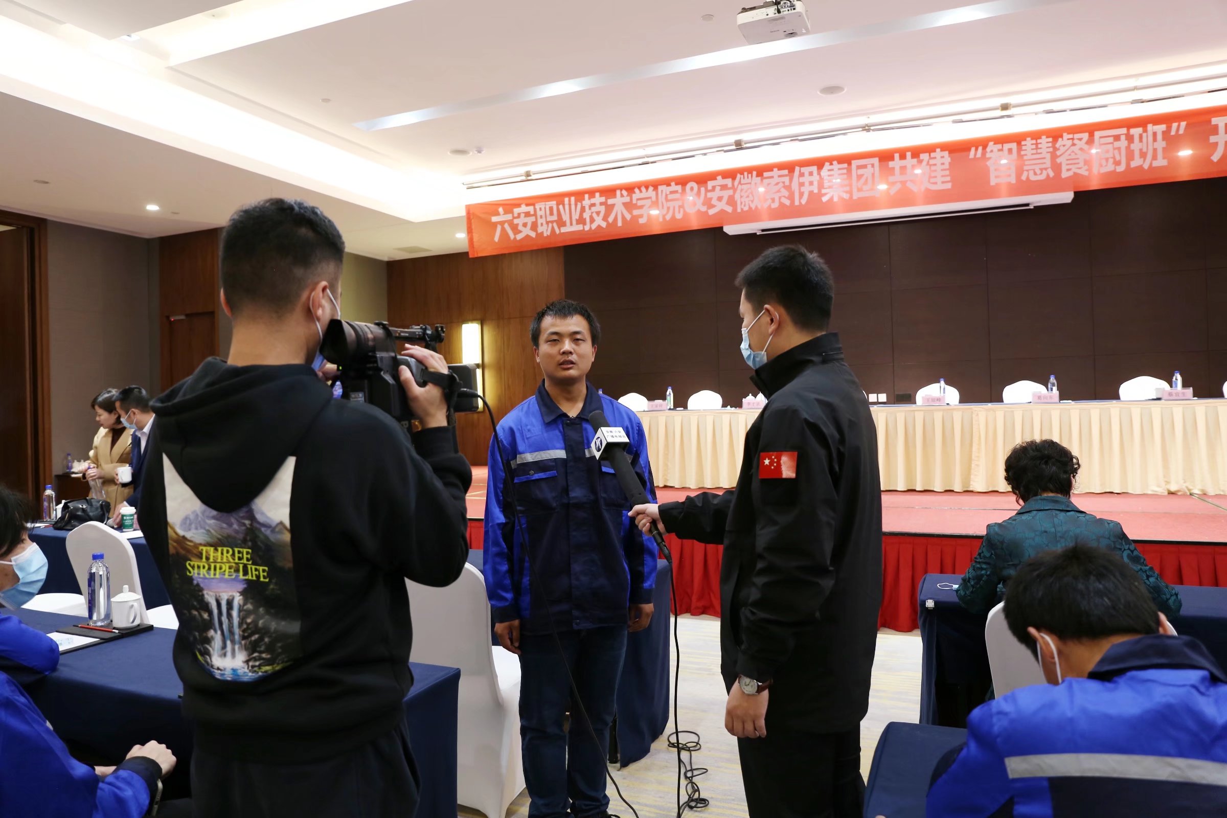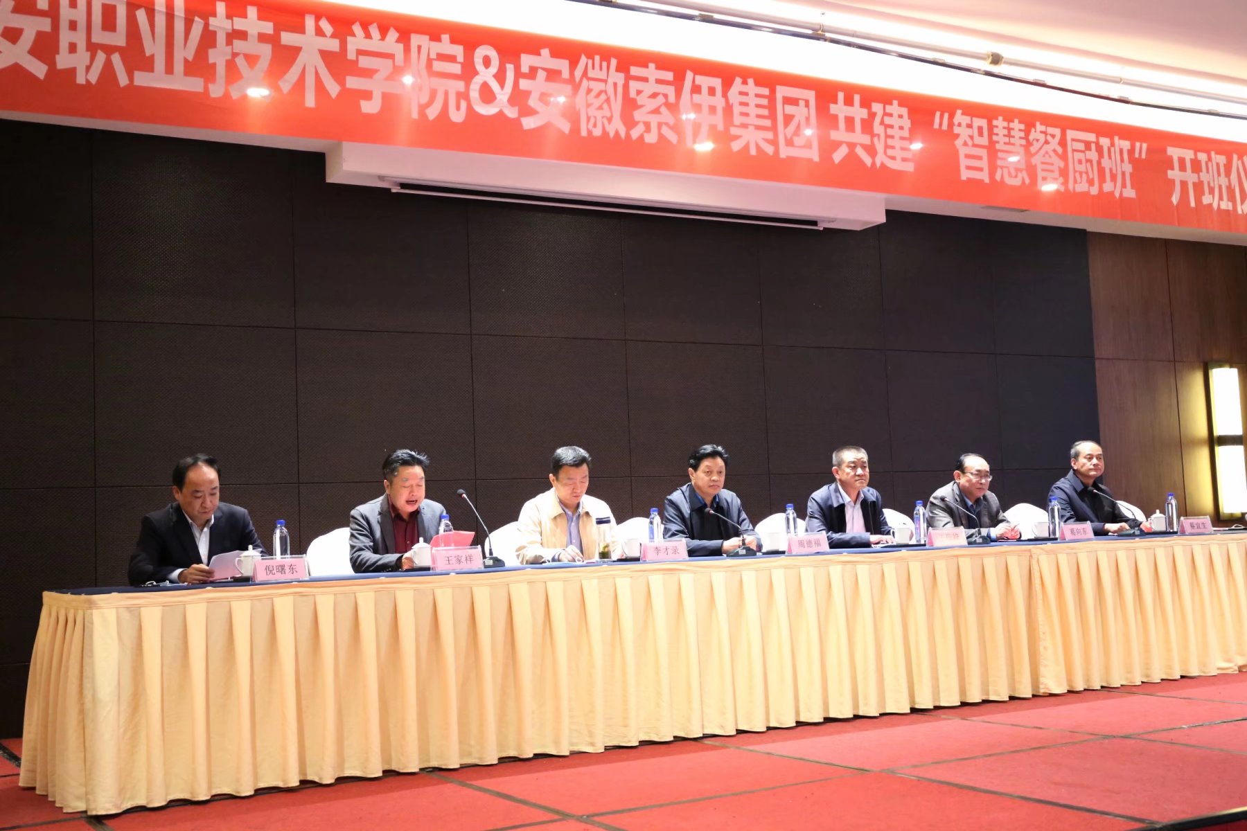 2021年11月5日下午四點,六安職業技術學院與安徽索伊集團共建“智慧餐廚”班開班儀式在六安索伊君瀾大酒店隆重舉行,六安職業技術學院黨委書記周德福,黨委副書記、院長葛向東,黨委委員、副院長王家祥,安徽索伊集團董事長王瓊峰,董事長助理倪曙東,黨委書記汪顯華參加了開班儀式,市經信局黨組成員、副局長李才錄、市人力資源保障局四級調研員蔡宜生應邀到會,以及智慧餐廚班的51位學生及老師共同參加了開班儀式。