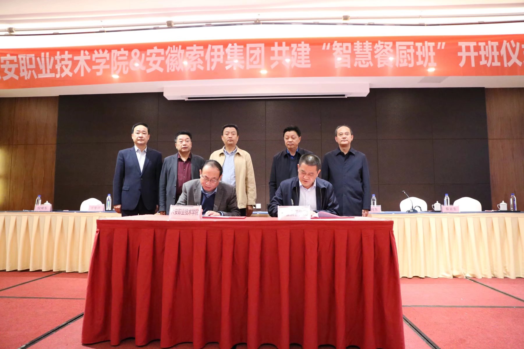 隨后,六安職業技術學院黨委副書記、院長葛向東和安徽索伊集團董事長王瓊峰簽署了合作協議。最后,六安職業學院黨委書記周德福作重要講話。他說這次安徽索伊集團與六安職業技術學院共建“智慧餐廚”班,就是探索校企合作的新模式,也是學院積極為企業服務,為地方經濟服務的具體體現。希望雙方相互合作,相互切磋,齊心協力把智慧餐廚班辦出特色,辦出好的效果。也希望同學們珍惜大好時光,認真學習,學好本領,成就事業,同時成就自己。