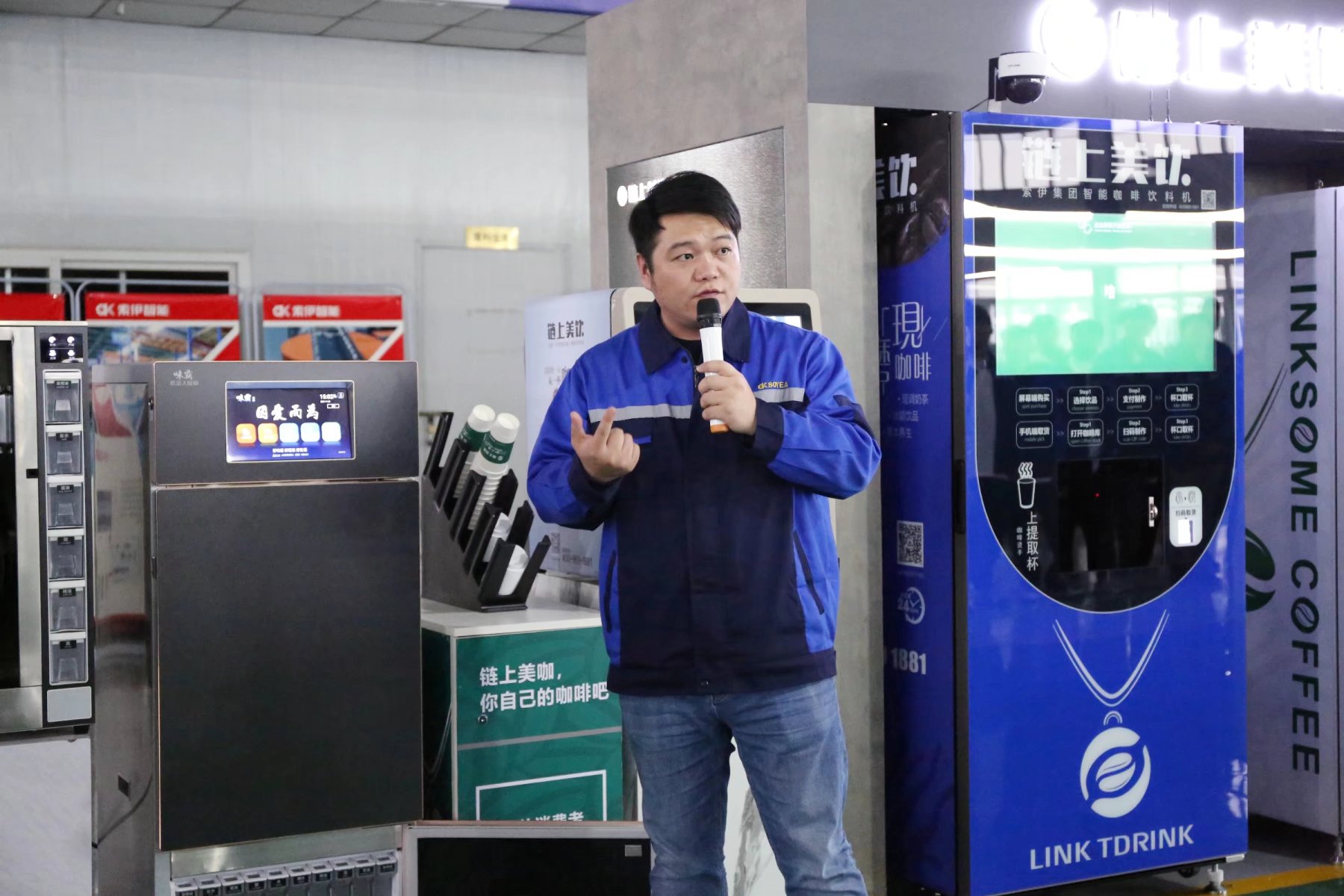 銷售部長方明洋介紹智能化數字烹飪機器人和智能化數字機器人飲料機等產品